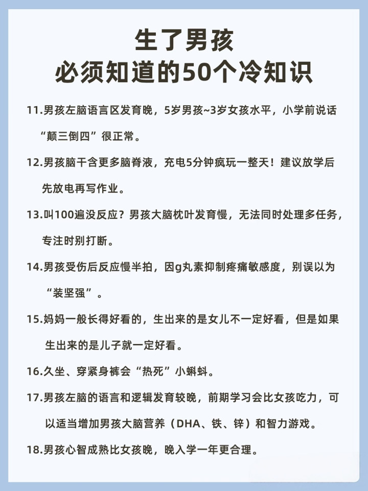 3. 男孩的胼胝体(连结控制脑的神经束)比女孩小,是以语言抒发才能发育偏慢,不是笨,是生理结构决定的。