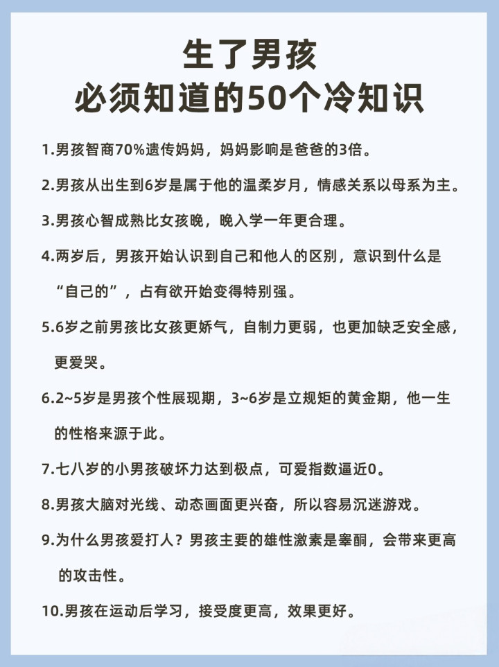 8. 男孩的心境调度才能发育比女孩晚2-3年,是以他哭闹的工夫也更长。
