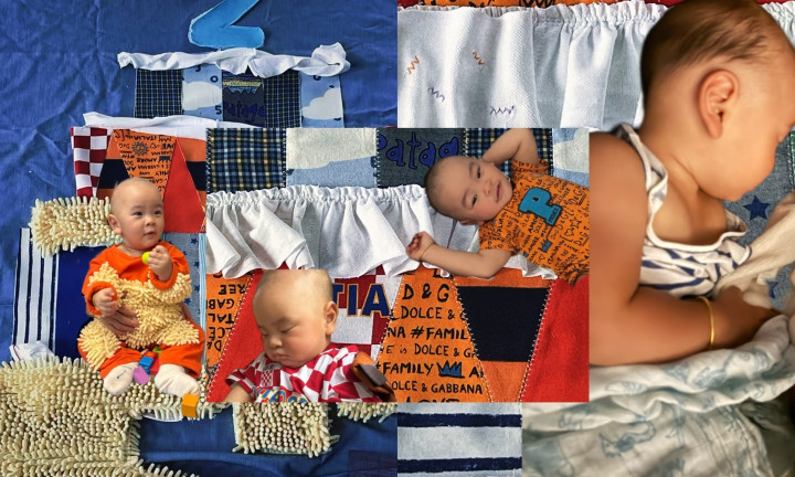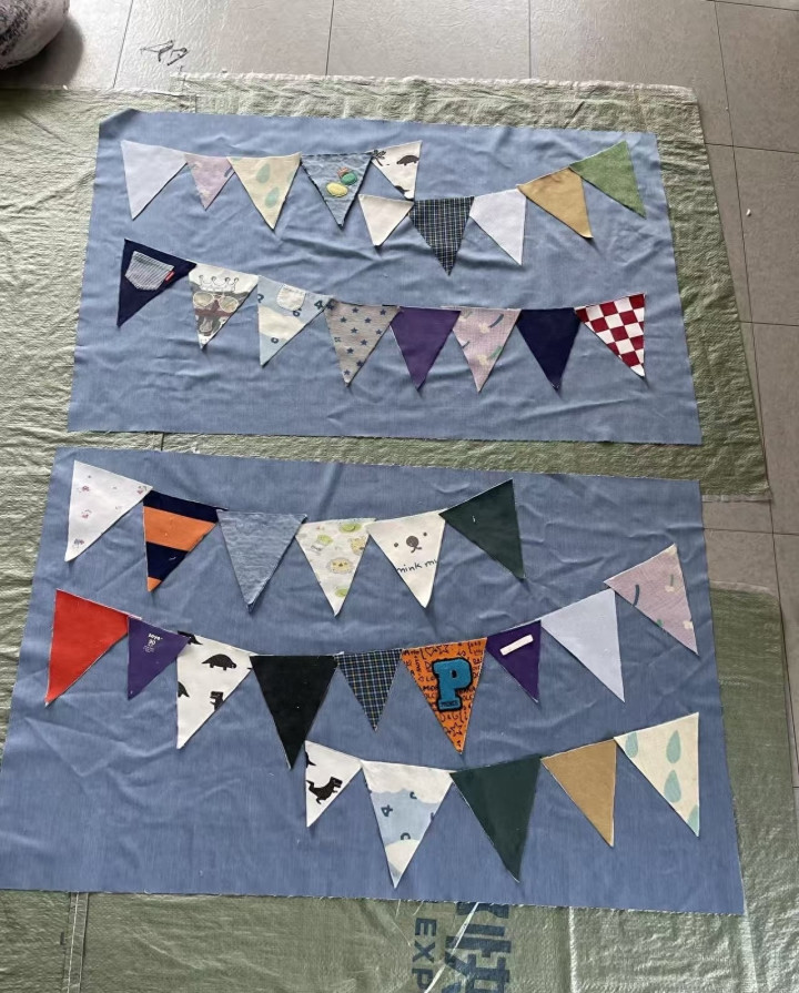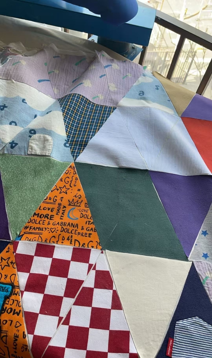 黄雅莉把男儿穿小了的衣裳都洗得鸡犬不留,然后剪成不同的局势铺在一块布上头,凑成了相迎面子的项目。