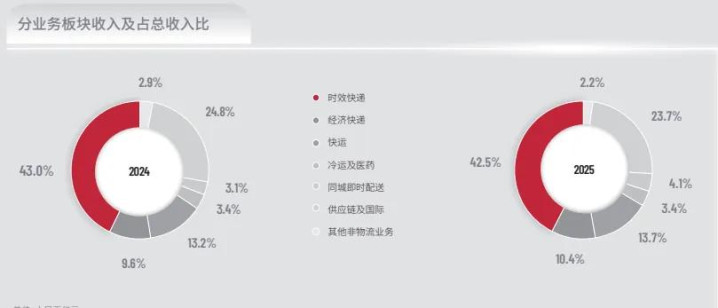 其中,撑起顺丰骨架的,依然是那块谁也抢不走的时效件底盘。这部分业务全年拿下了1310.5亿元的营收,同比增长7.2%。