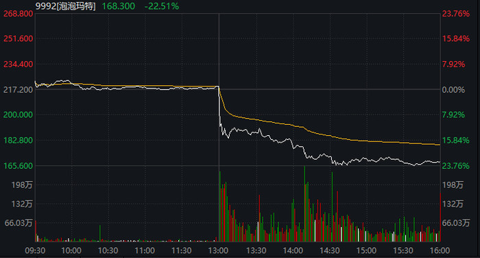 3月25日午后,港股泡泡玛特大跌,限制收盘,跌幅超22%。