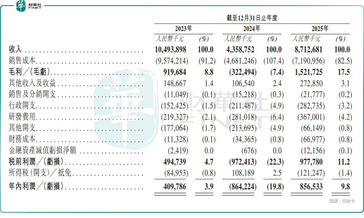 2023年至2025年的毛利率分袂为8.8%、-7.4%、17.5%。