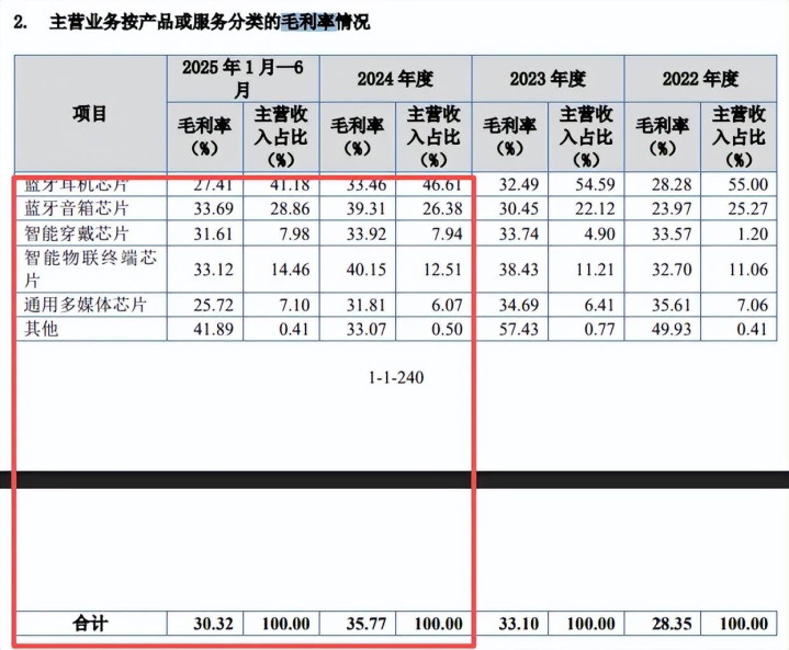 需要指出的是,主营业务毛利率波动较大,区别为28.35%、33.1%、35.77%、30.32%,昨年上半年较上年末下滑5.45个百分点,中枢居品蓝牙耳机芯片、蓝牙音箱芯片、智能穿着芯片、智能物联末端芯片、通用多媒体芯片毛利率皆降,昨年上半年区别为27.41%、33.69%、31.61%、33.12%、25.72%,较上年末区别下滑6.05个百分点、5.62个百分点、2.31个百分点、7.03个百分点、6.09个百分点,是利润降幅远超收入的要津。