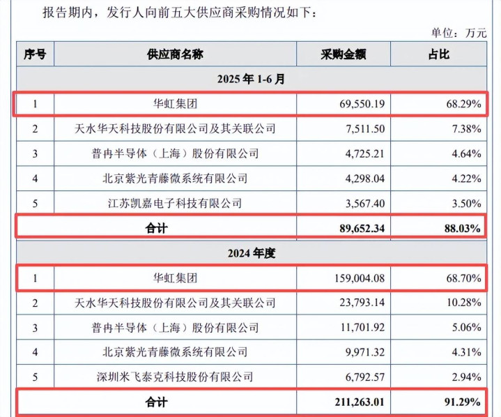 前五供应商包括华虹集团、天水华天科技股份有限公司、普冉半导体(上海)股份有限公司、北京紫光青藤微系统有限公司、江苏凯嘉电子科技有限公司,其中对华虹集团采购占比最高,且呈现高涨态势,区别为89,541.67万元、123,475.81万元、159,004.08万元、69,550.19万元,占比区别为58.5%、62.94%、68.7%、68.29%,存在向单一供应商采购占比超50%的情形。