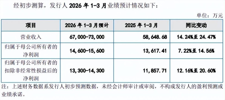 据短平快解读了解,经初步测算,公司预估2026年Q1兑现营业收入6.7亿元至7.3亿元,同比增长14.24%至24.47%,归母净利润为1.46亿元至1.56亿元,同比增长7.22%至14.56%,事迹有所回暖。