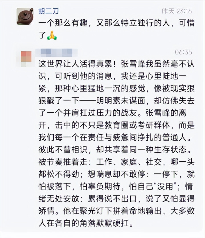 这天下让东说念主活得真累!张雪峰我虽然绝不料志,可听到他的音尘,我照旧心里陡地一紧,那种心里猛地一千里的嗅觉,像被现实狠狠戳了一下——明明素昧生平,却仿佛失去了一个并肩扛过压力的战友。张雪峰的离开,击中的不仅仅熟悉圈或考研群体,而是咱们每一个在背负与窘况间抵御的泛泛东说念主。彼此不曾清醒,却分享着兼并种生涯景象。被节拍推着走:责任、家庭、酬酢,哪一头皆松不得劲;思喘气却不敢停:一停驻,生怕被落下,怕亏负期待,怕我方“没用”;情愫无处安放:累得说不出口,说了又怕显得矫强。他在聚光灯下拼着命地输出,大多数东说念主在各自的边缘缄默硬扛。