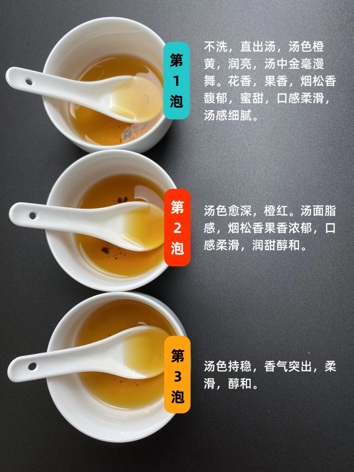 第二泡,汤色愈深,橙红。汤面脂感,烟松香果香浓郁,口感柔嫩,润甜醇和。