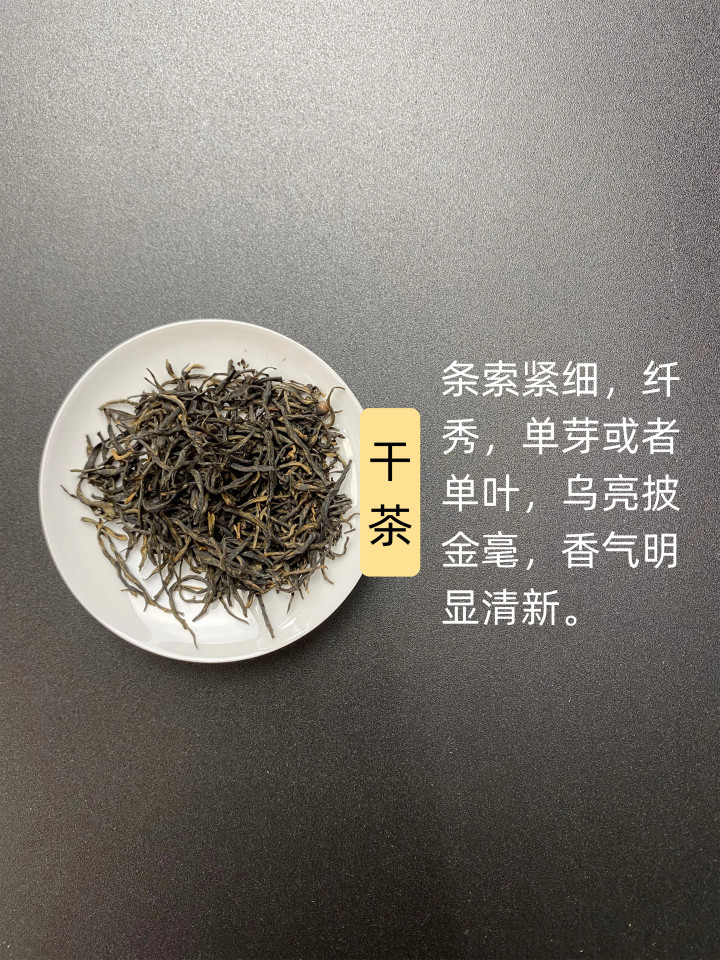 干茶,条索紧细,纤秀,单芽约略单叶,乌亮披金毫,香气彰着簇新。