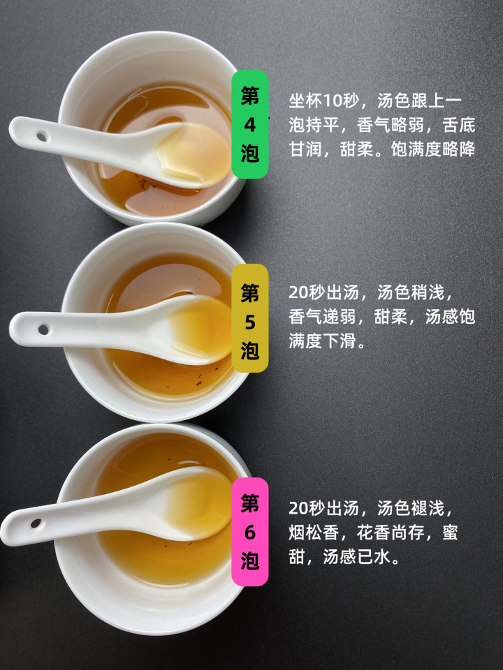 第六泡,20秒出汤,汤色褪浅,烟松香,花香尚存,蜜甜,汤感已水。