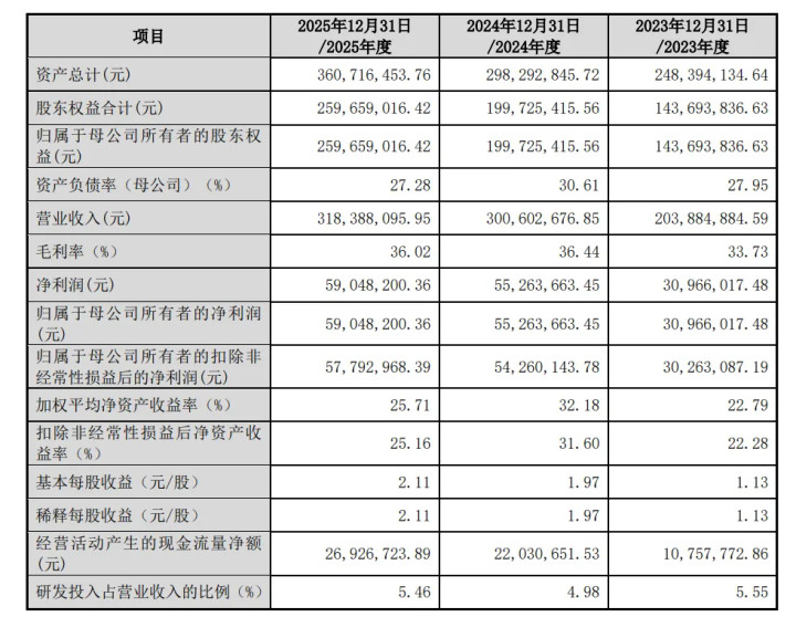 2023年至2025年,公司主营业务收入分裂为2.04亿元、3.01亿元、3.18亿元;扣非净利润分裂为3026.31万元、5426.01万元、5779.30万元。数据裸露,营收与净利润增速呈断崖式下降,2024年营收同比增长47.44%、净利润同比增长78.47%,2025年营收增速降至5.92%、净利润增速仅6.85%,盈利增长动能衰减。