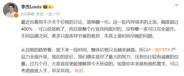 【CNMO科技音信】3月26日,一加中国区总裁李杰发文,就手机价钱高潮接洽辩论发表认识。