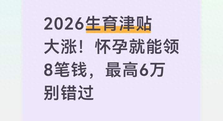 一、开篇:2026生养福利升级!怀胎就能领8笔钱,别白丢几万