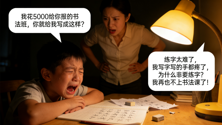 深宵10点,孩子趴在书桌前抹眼泪,功课本上是歪七扭八的字,纸被橡皮擦得破褴褛烂。姆妈咆哮:“我花5000给你报的书道班,你就给我写成这么?”孩子崩溃大叫:“练字太难了,我写字写的手王人疼了,为什么非要练字?我再也不上书道课了!”