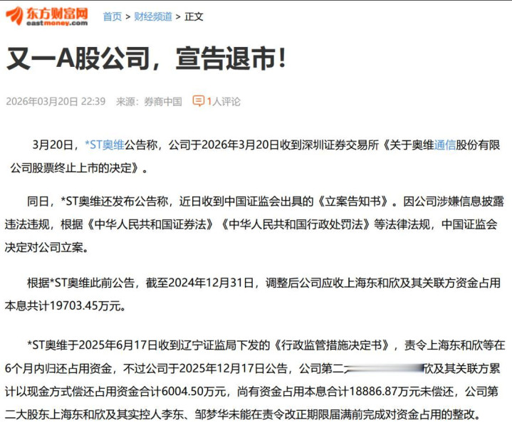 夙昔许多东谈主有一种惯性想维,以为公司退市了就算翻篇了。但*ST奥维此次不太雷同,深交所的退市决定和证监会的立案见知书是并吞天地发的,这个时辰节点的秉承很耐东谈主寻味。