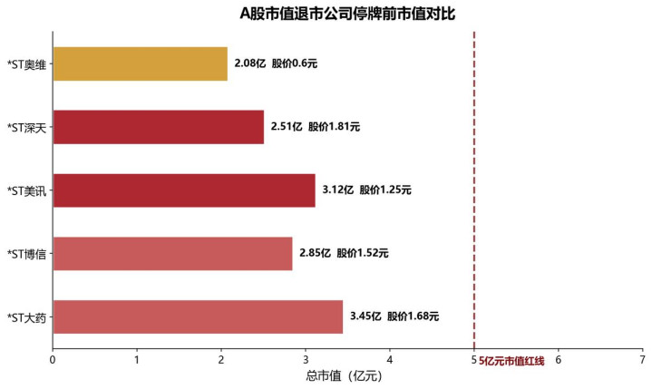 2025年改换版上市端正在面值退市的基础上,又加了沿路5亿元市值红线。*ST深天成为A股首家因市值不达标而退市的公司,停牌时股价1.81元,市值2.51亿元。随后*ST好意思讯、*ST博信、*ST大药也接踵触发并吞条目。到了*ST奥维,0.6元的股价和2.08亿元的市值,也曾远远低于这条存一火线。