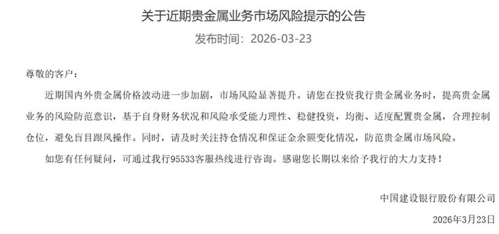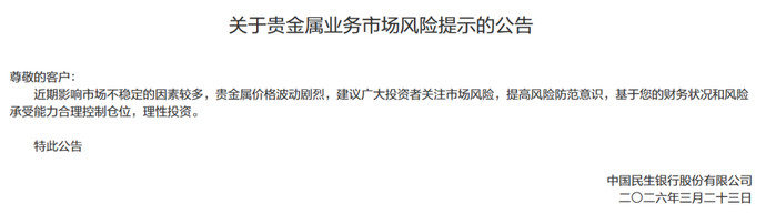 3月23日,成立银行发布《对于近期贵金属业务市集风险领导的公告》:
