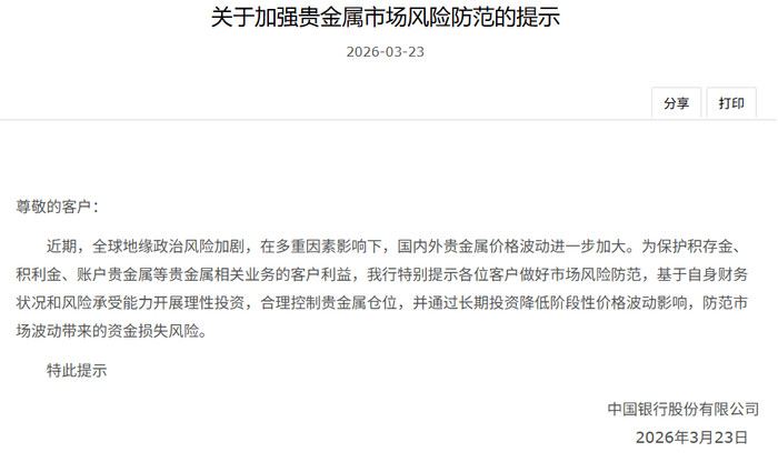 中国银行发布公告称,近期,人人地缘政事风险加重,ued官方网站在多蹙迫素影响下,国表里贵金属价钱波动进一步加大。为保护积聚金、积利金、账户贵金属等贵金属联系业务的客户利益,我行特殊领导诸君客户作念好市集风险审视,基于自己财务景象和风险承受智商开展感性投资,合理阻抑贵金属仓位,并通过恒久投资缩小阶段性价钱波动影响,审视市集波动带来的资金失掉风险。