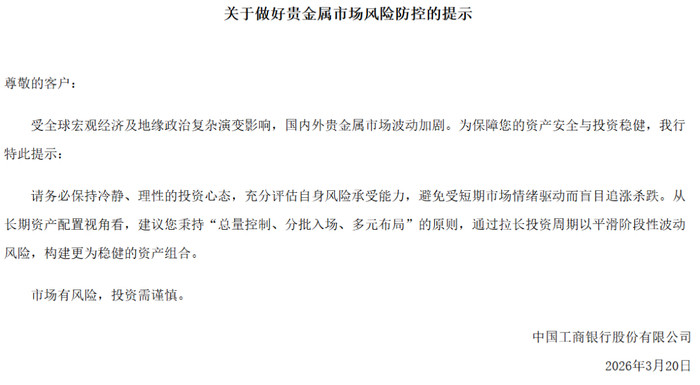 3月20日,工商银行发布《对于作念好贵金属市集风险防控的领导》: