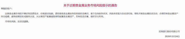 招商银行发布《对于近期贵金属业务市集风险领导的晓喻》: