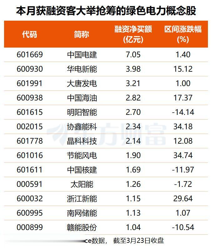 3月以来,66只绿电成见股获融资净买入,中国电建获加仓超7亿元,华电新能、大唐发电获加仓均超3亿元。其中华电辽能本周主力资金净流入显耀,拓日新能3月23日单日主力资金净流入5.83亿元,露出杠杆资金和主力资金对绿电池块的狠恶看好。