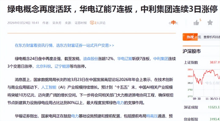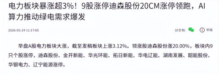 3月24日,电力板块暴涨超3%!9股涨停迪森股份20CM涨停领跑,AI算力推动绿电需求爆发