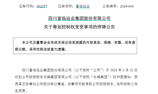 3月25日晚间,富临运业(002357)发布公告称,公司于当日收到控股推进永锋集团有限公司的书面见知,获悉其正在有筹商公司股份转让事宜,该事项可能导致公司控股推进、内容适度东谈主发生变更。