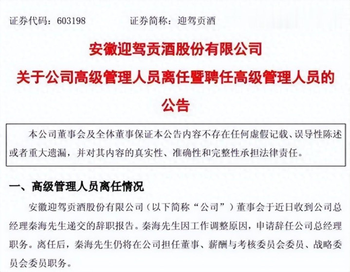 3月10日晚间,迎驾贡酒发布公告表示,秦海因使命和解原因,苦求辞任公司总司理职务。