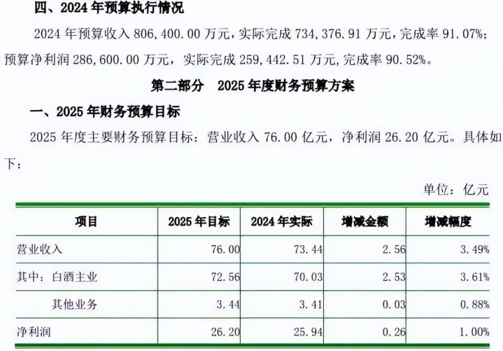 凭证2025年5月发布的2024年年度鼓舞大会会议材料,迎驾贡酒2025年度主要财务预算认识为:交易收入76.00亿元(同比增长3.49%),净利润26.20亿元(同比增长1%)。其中,白酒主业2025年认识为72.56亿元,瞻望同比增长3.46%。