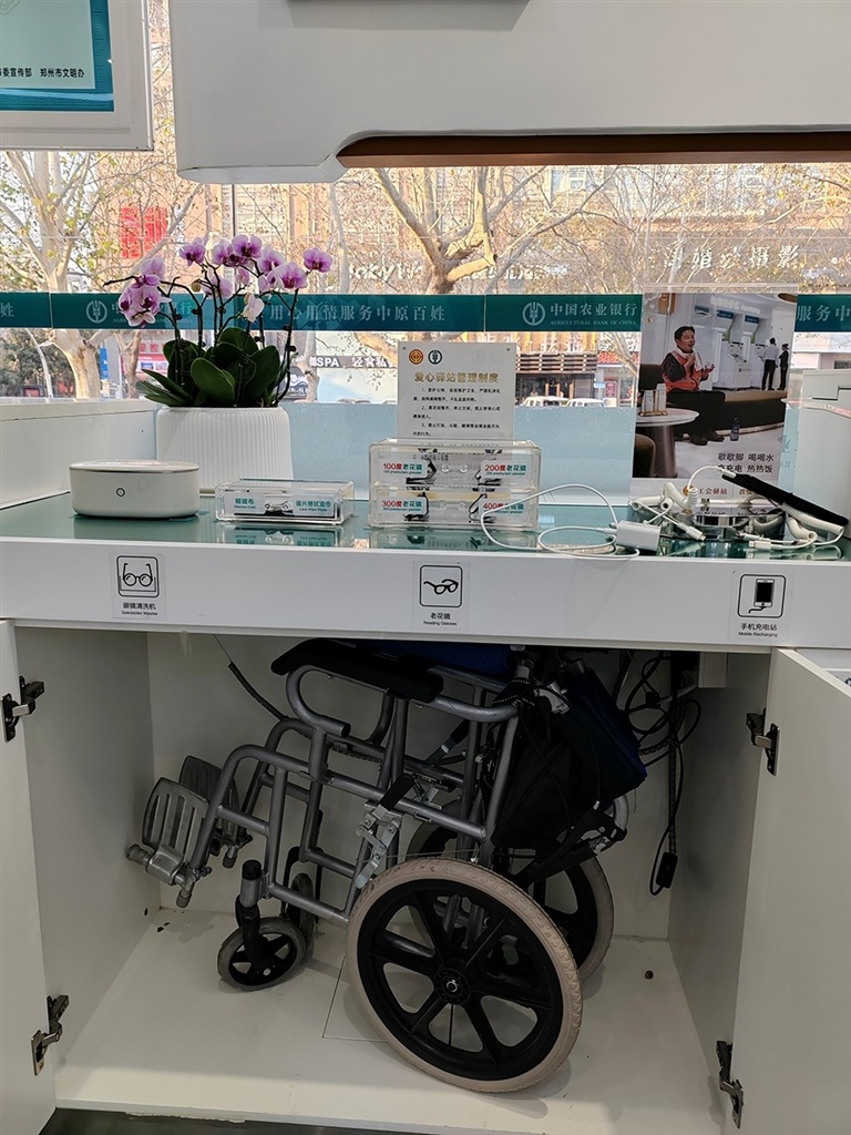 在中国农业银行郑州东风路支行的“浓情暖域便民处事区”,配备有老花镜、放大镜、便民药箱、便民袋、轮椅等。 河南日报全媒体记者 李鹏 摄